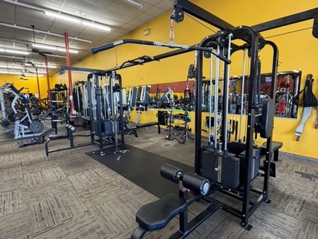 Multi-functional cable machine including 8 stations: 2 pulley towers, 2 tricep pushdown systems, 2 seated cable rows, 2 cable lateral pulldowns, and a pull-up bar